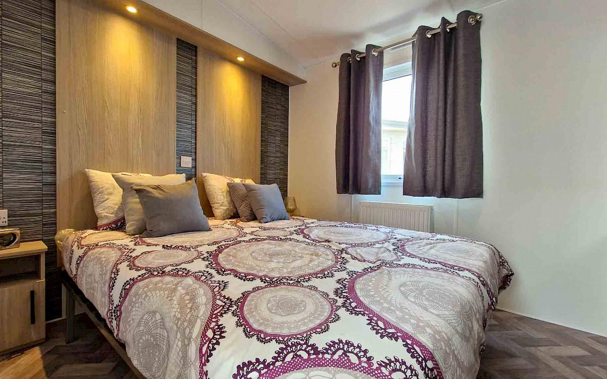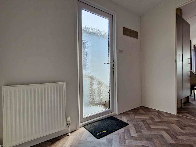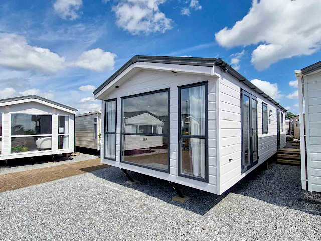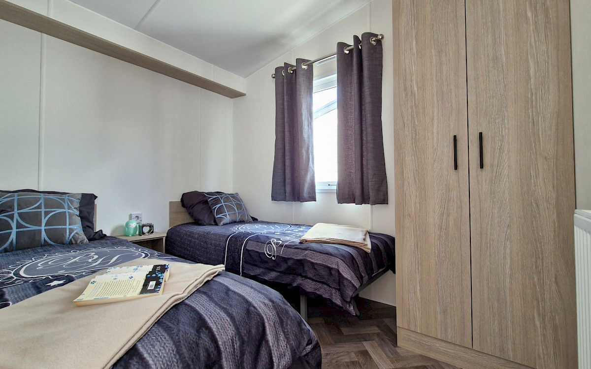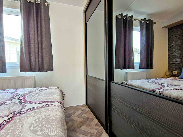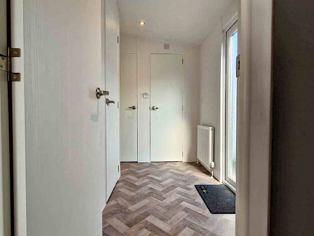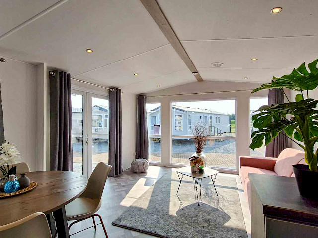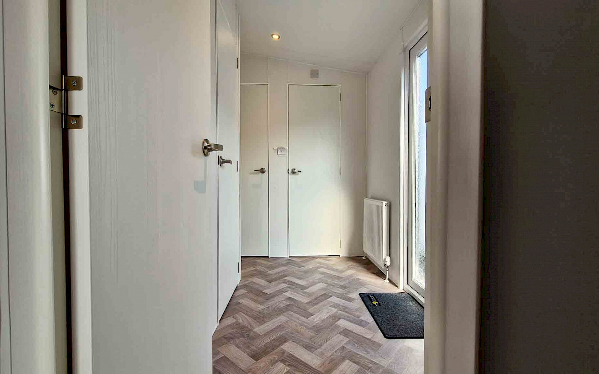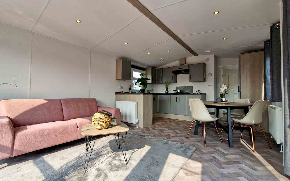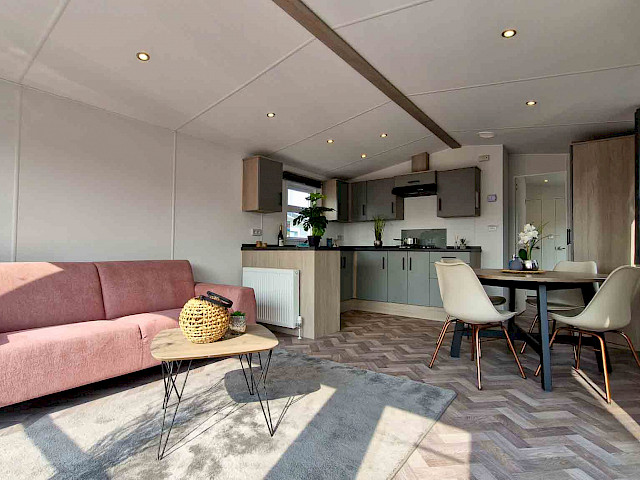 The large window to the front provides an abundance of natural light, making the room feel even bigger and brighter. The double patio doors invite you to step outside and enjoy your surroundings. The interior is fully clad in modern vinyl herringbone flooring, which not only looks stylish but is also easy to maintain.