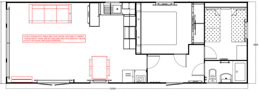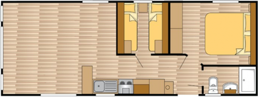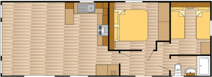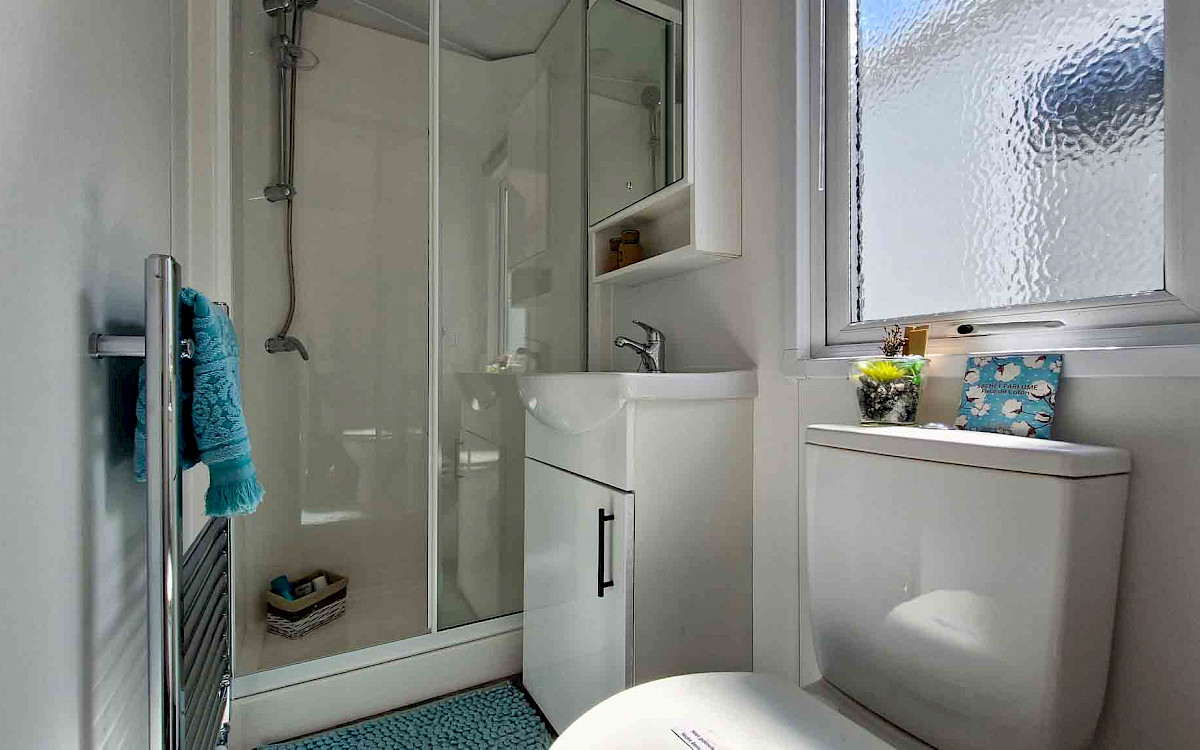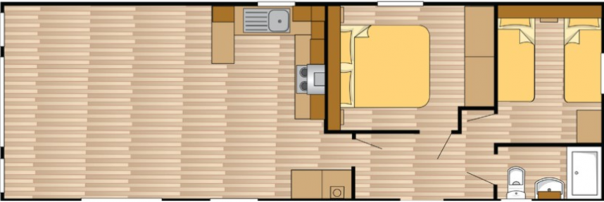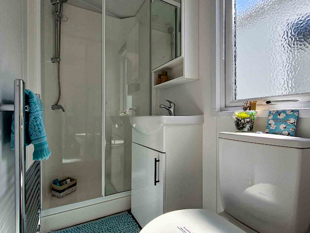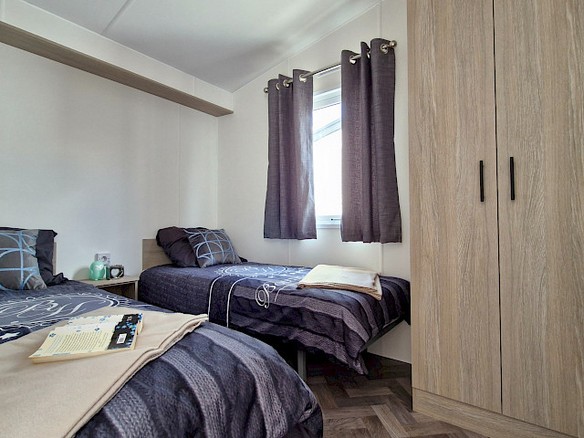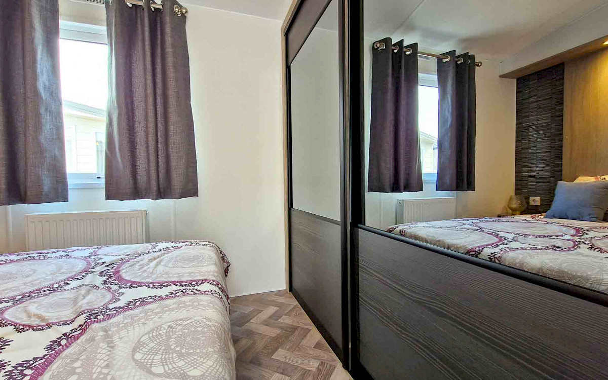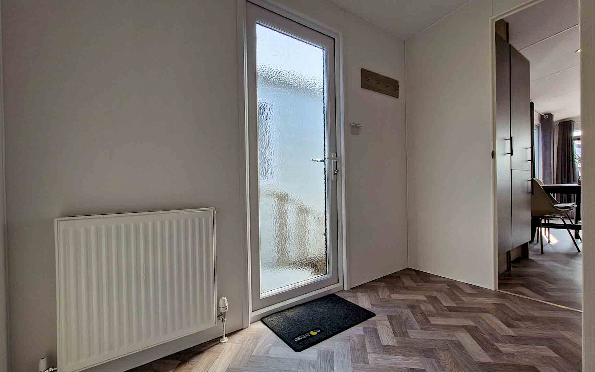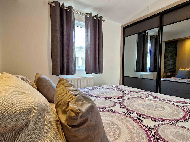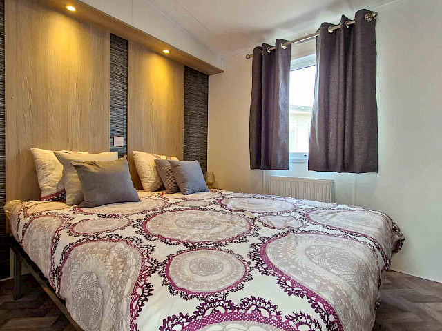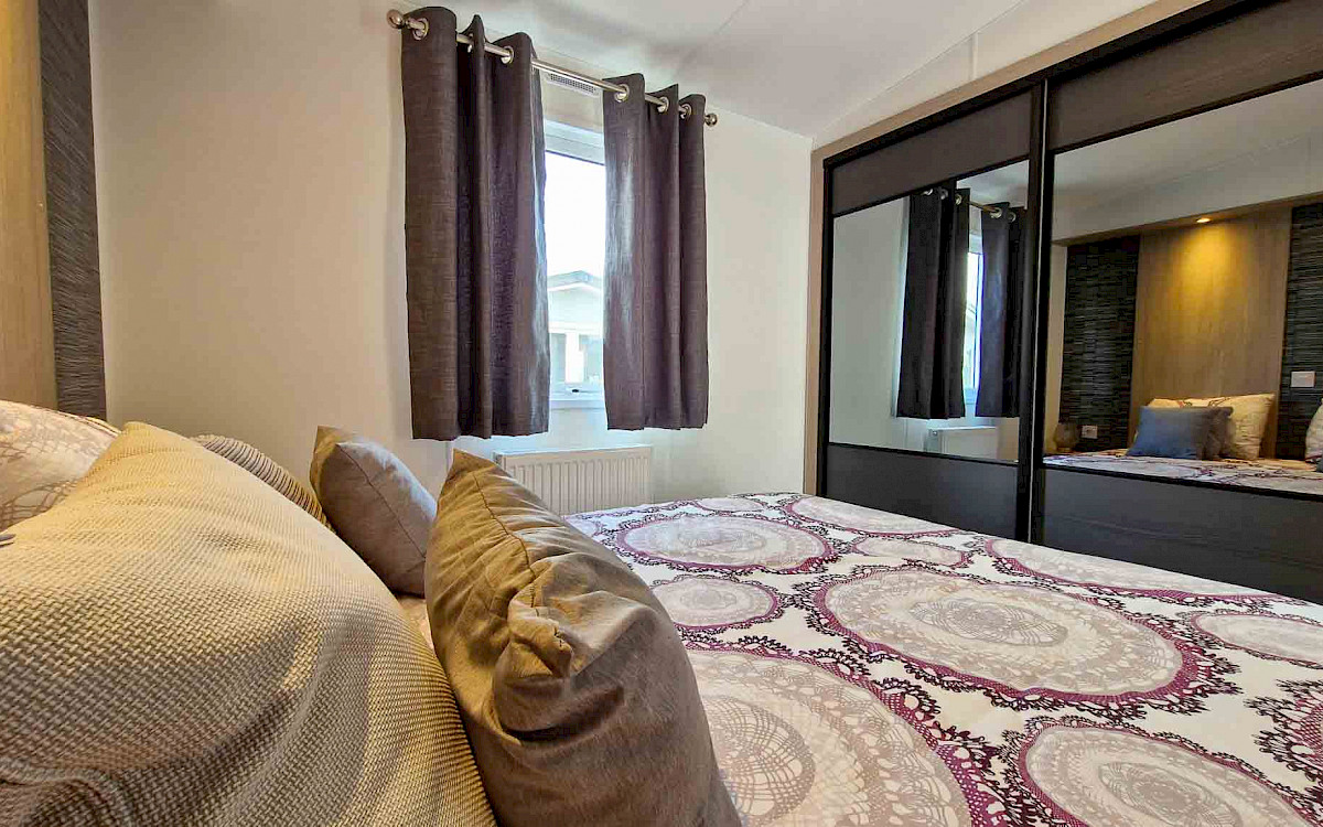 The large window to the front provides an abundance of natural light, making the room feel even bigger and brighter. The double patio doors invite you to step outside and enjoy your surroundings. The interior is fully clad in modern vinyl herringbone flooring, which not only looks stylish but is also easy to maintain.