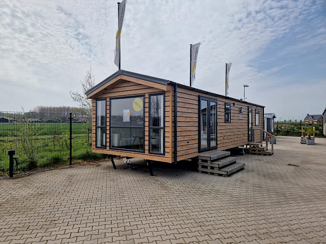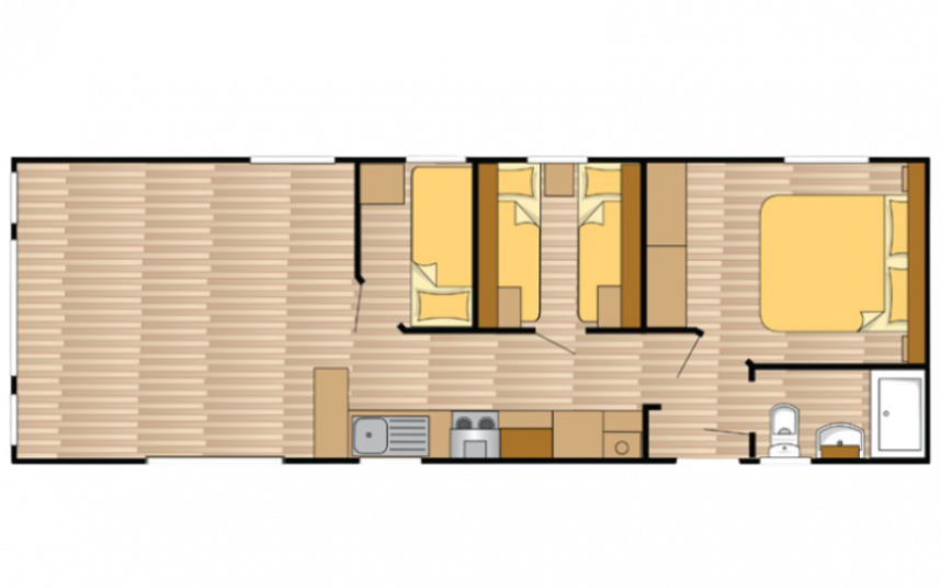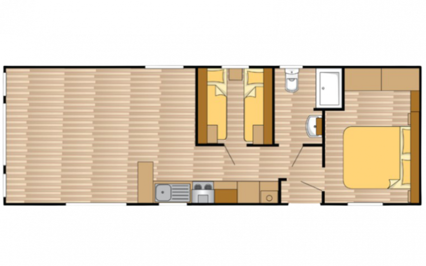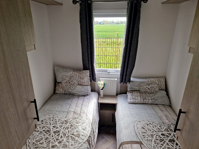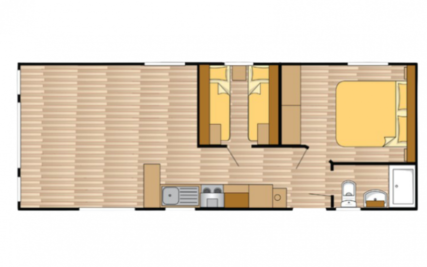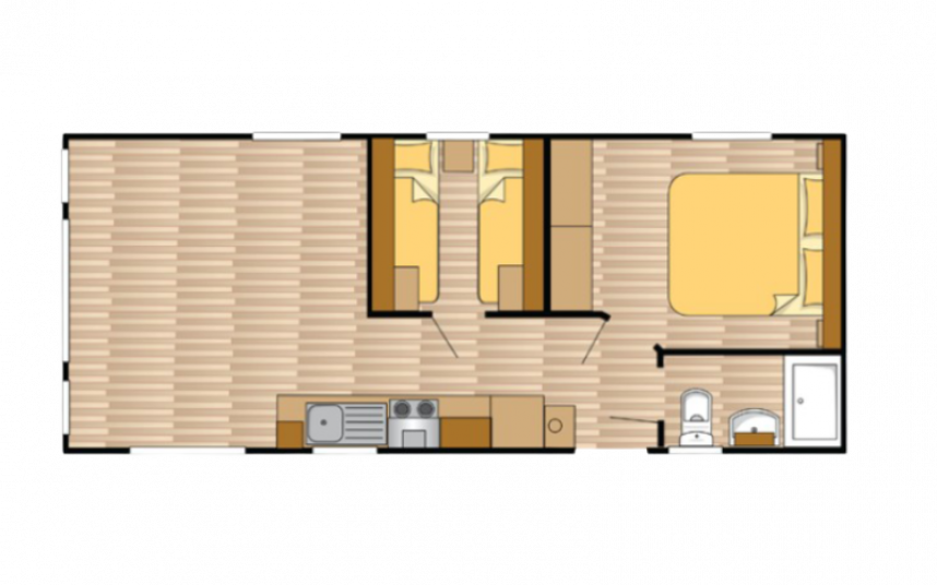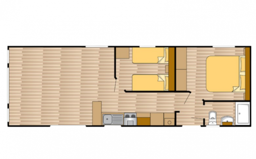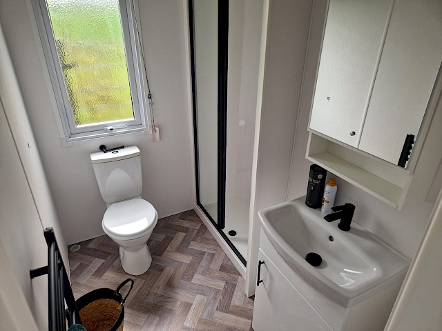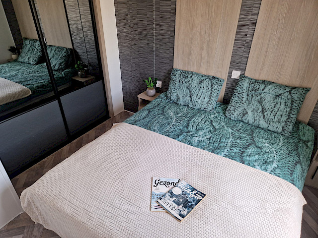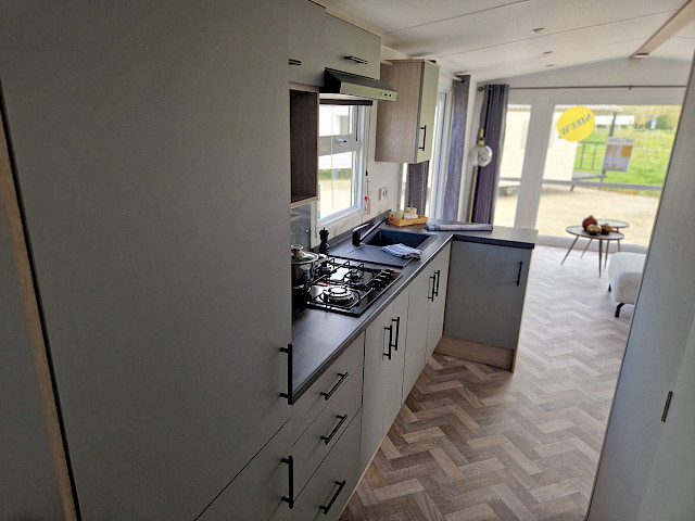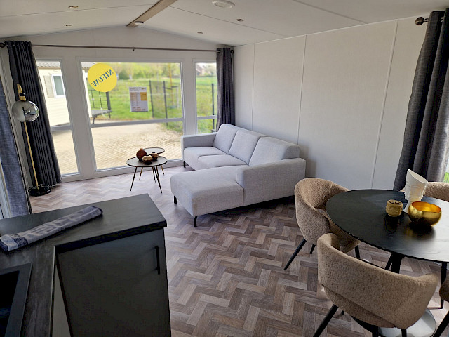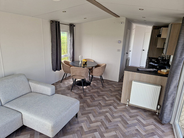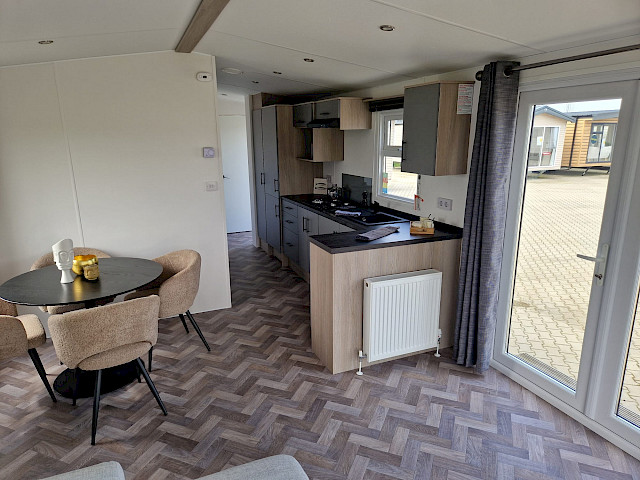 The Ocean mobile home offers everything you need for a comfortable stay. The large windows and patio doors provide an abundance of natural light and a seamless transition to the outdoors. The stylish herringbone-patterned vinyl flooring creates a modern and warm atmosphere. The L-shaped kitchen, with elegant black accents, is fitted with a 4-burner hob and a built-in fridge-freezer. The Ocean also offers two bedrooms with ample storage space and a bathroom featuring a spacious shower cubicle and a toilet.