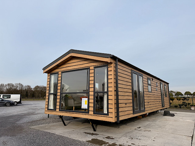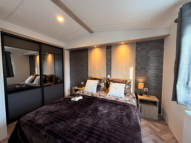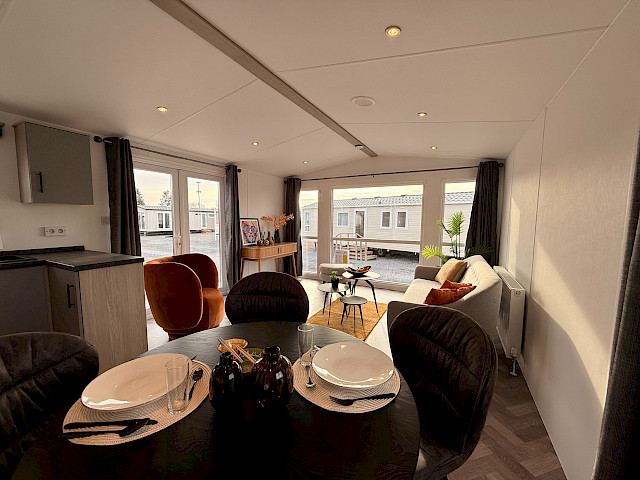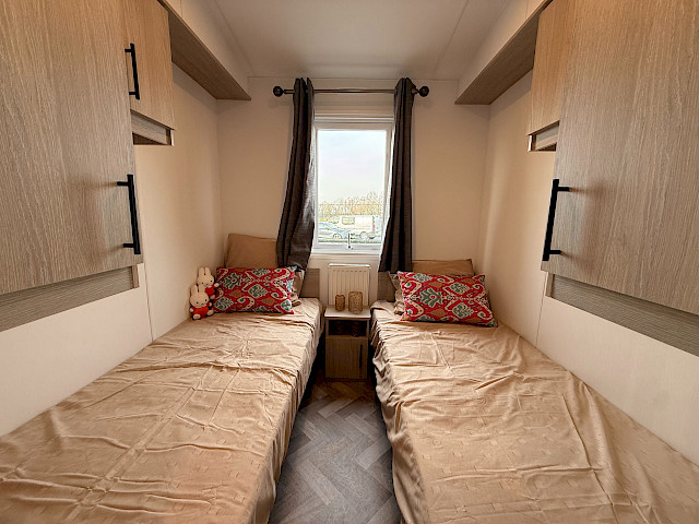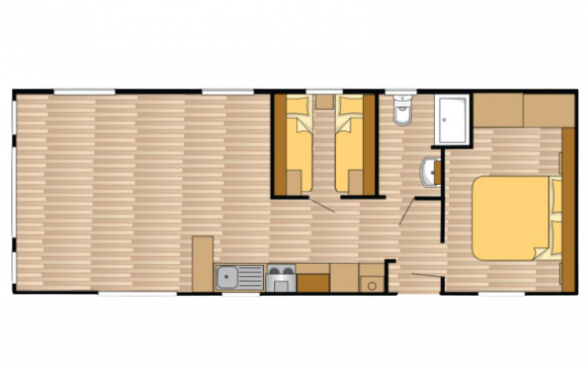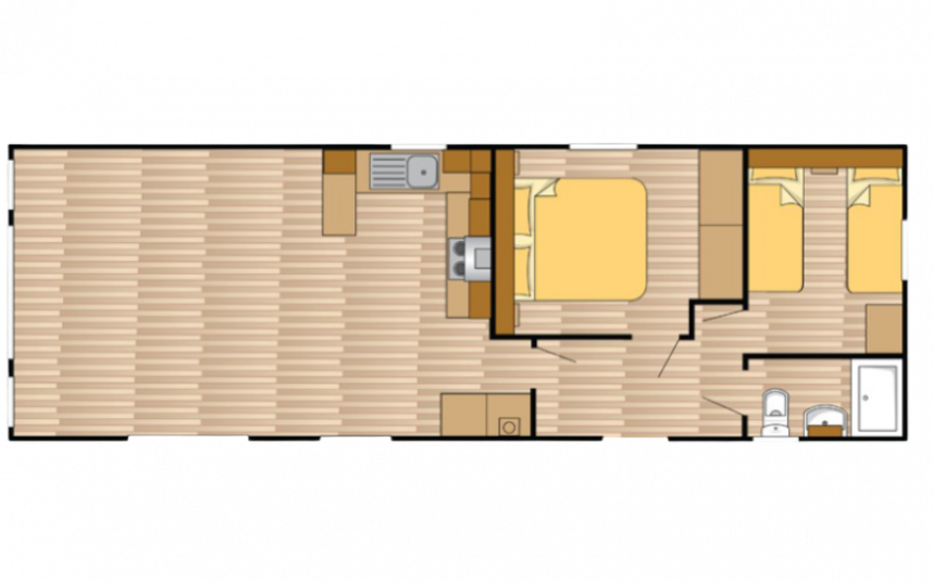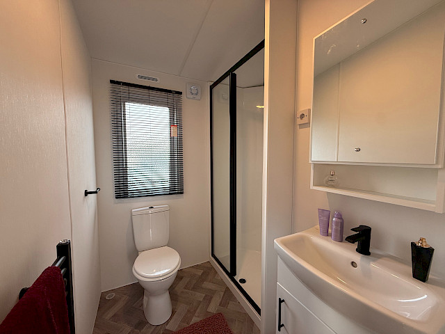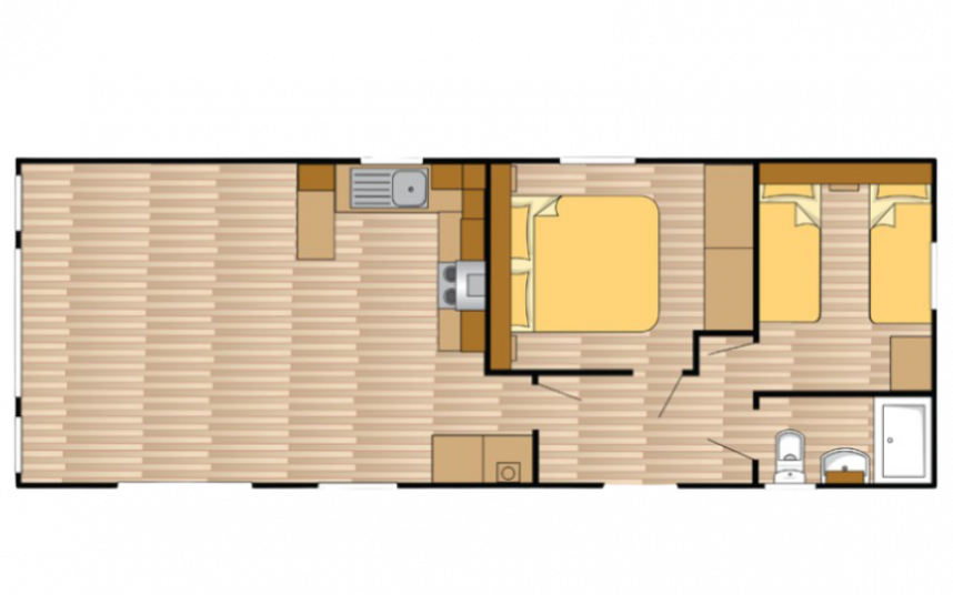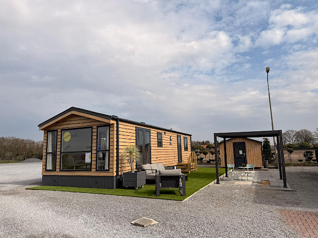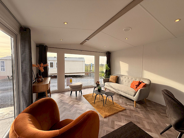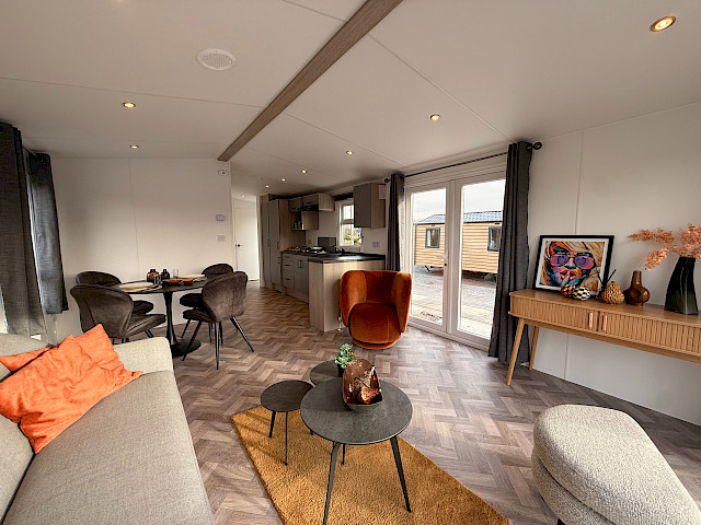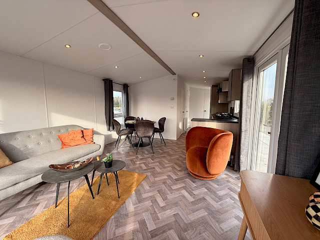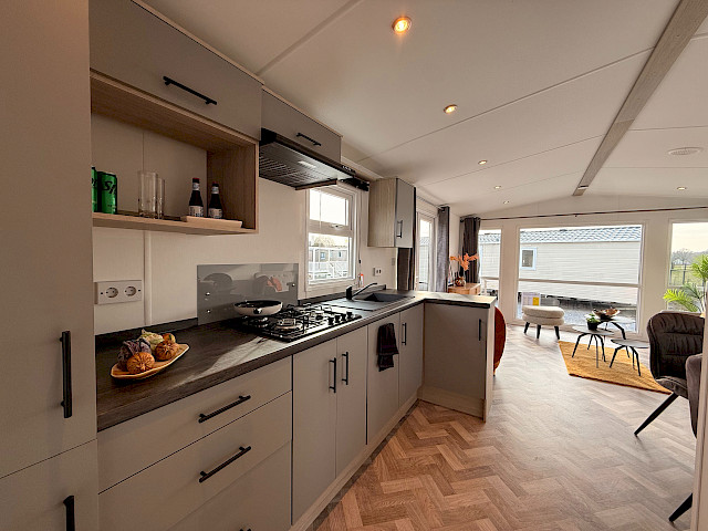 The Ocean mobile home offers everything you need for a comfortable stay. The large windows and patio doors provide an abundance of natural light and a seamless transition to the outdoors. The stylish vinyl flooring in a herringbone pattern gives a modern and warm look. The L-shaped kitchen with elegant black accents is equipped with a 4-burner stove and a built-in fridge/freezer. The Ocean also offers two bedrooms with ample storage space and a bathroom with a spacious shower cubicle and toilet.