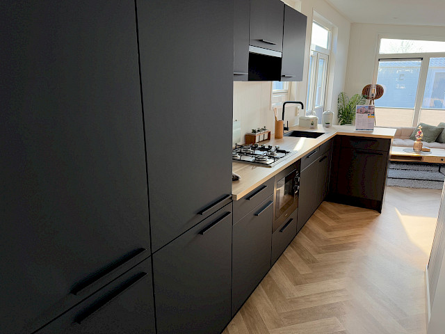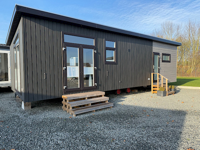 The images above show the following model: 1100 x 400 - 2 bedrooms. With the following options: Anthracite rain pipes, coloured fascia boards, coloured window frames, wall-mounted toilet, Silentlines wall covering, separately switched outdoor socket, dishwasher, black sink and tap, kitchen price group 2 mouse guard and a pleated blind package. Total price: €90,486.