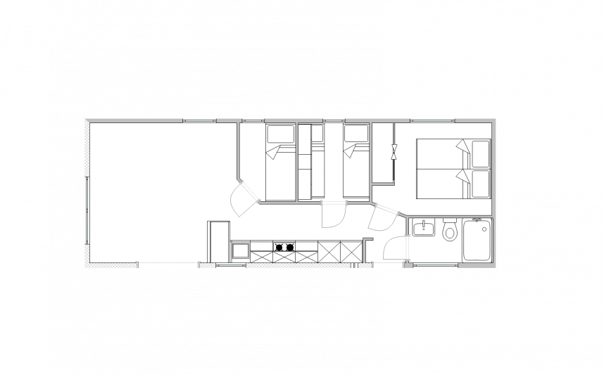 The Volente Deluxe offers everything you need for a comfortable stay. The spacious living room has vinyl flooring, large patio doors and a TV connection. The L-shaped kitchen is fully equipped, with plenty of storage space, a 4-burner hob, extractor hood and a built-in fridge/freezer. The master bedroom has a double bed and a spacious wardrobe with sliding doors. The guest/children's room has two single beds and handy hanging cupboards for extra storage space. The modern bathroom features stylish vanity units, a designer radiator, a toilet and a spacious shower cubicle with a tile pattern on the wall. The chalet is finished with wood-effect plastic cladding, plastic window frames, double glazing and central heating - a perfect balance between comfort and sustainability.