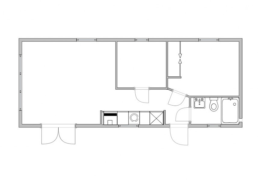 The images above show the following model: 1100 x 400 - 2 bedrooms, with the following options: dishwasher, combi oven, wall cabinets in the small bedroom, box-spring beds, and a curtain set. Total price: €68,670.