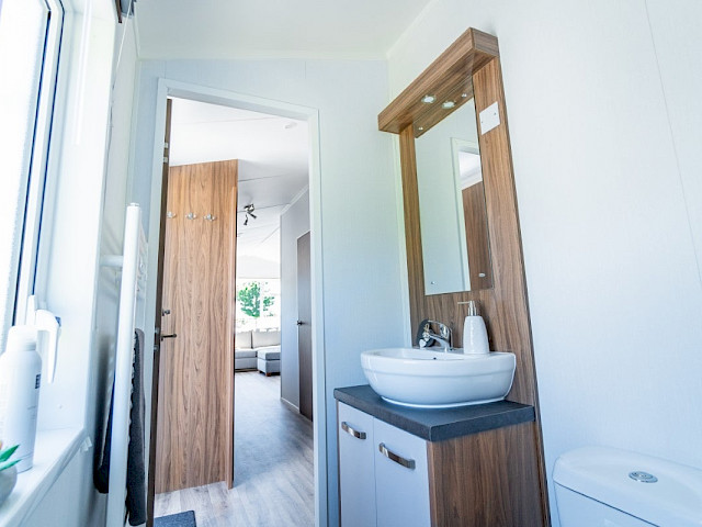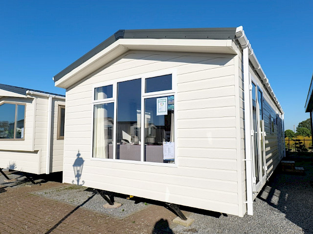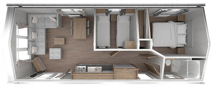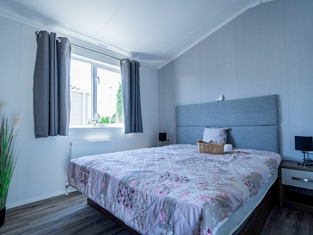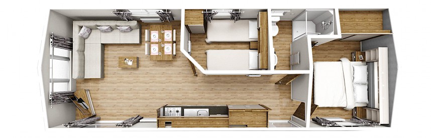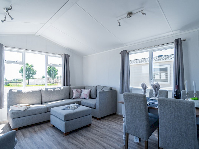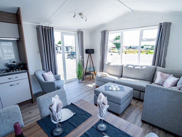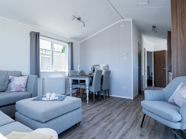 When you choose the Willerby Lumic furniture package, you get grey curtains in the bedrooms, variegated curtains in the living room, a dining table with 4 chairs, a sofa bed, a hocker, a TV cabinet, a coffee table, and a bed frame in the master bedroom.