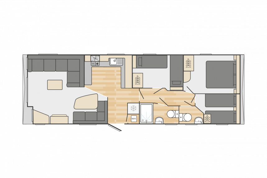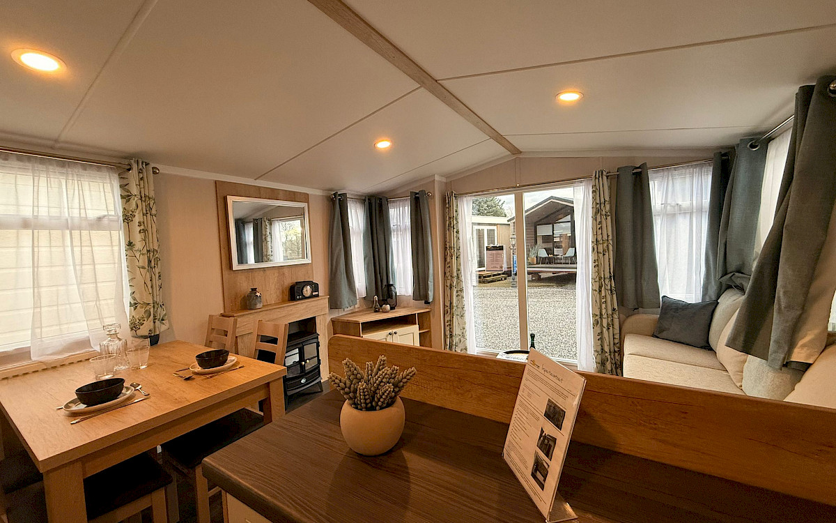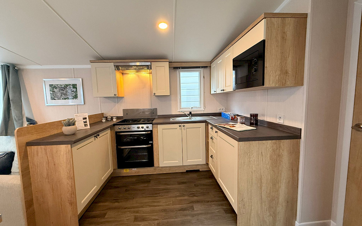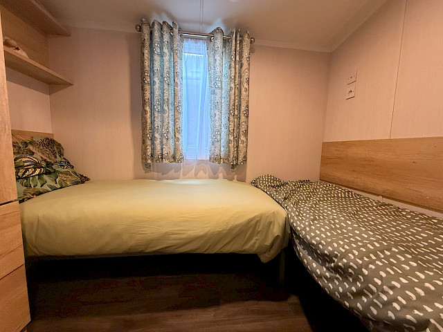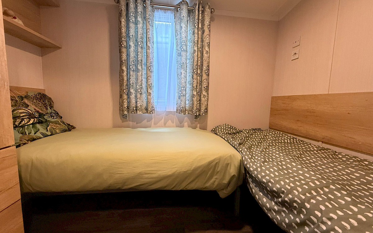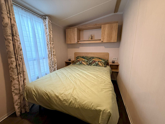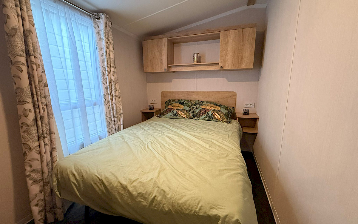 The Swift Burgundy has a timeless and practical design. The botanical upholstery and garden doors at the front of this holiday chalet bring nature from the outside in. The Burgundy is therefore not one of Swift's most popular leisure models for nothing. The cosy living room with electric fireplace and spacious U-kitchen are an ideal living environment during your holiday stay. The bedrooms are equipped with luxury mattresses and in the small bedroom, one bed can be stored under the other for extra space. Curious about this model? Feel free to visit our show site and discover this model.