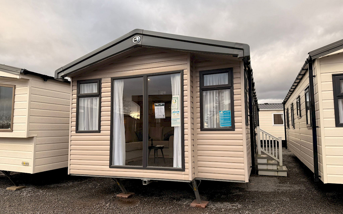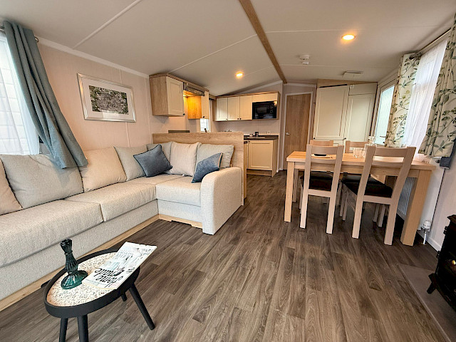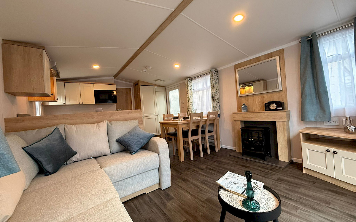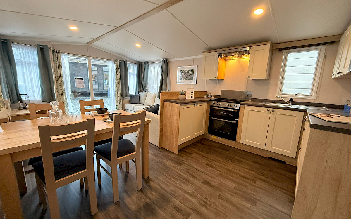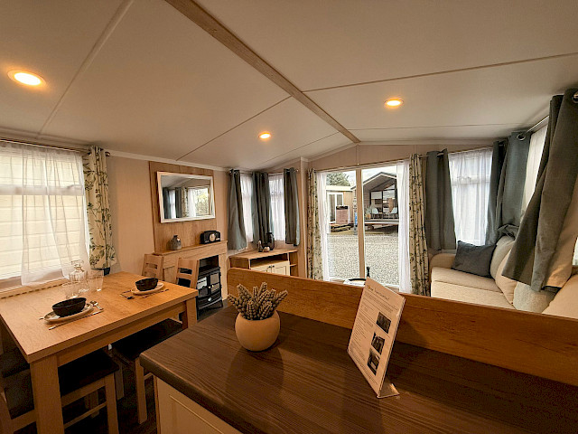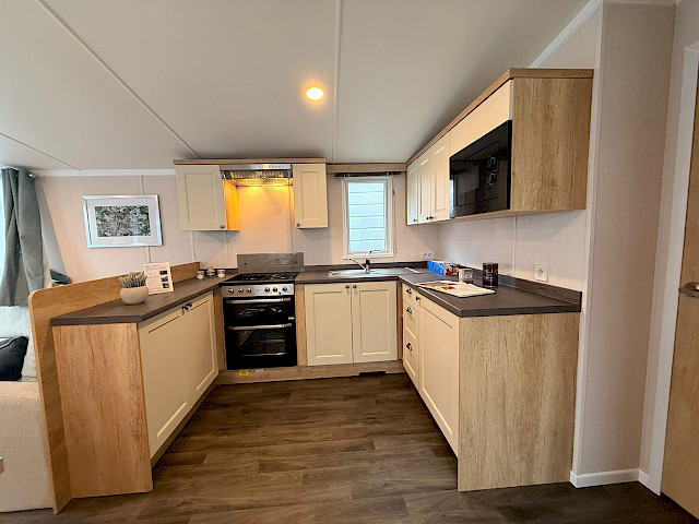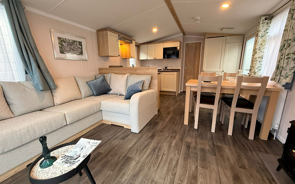 The Swift Burgundy has a timeless and practical design. The botanical upholstery and garden doors at the front of this holiday chalet bring nature from the outside in. The Burgundy is therefore not one of Swift's most popular leisure models for nothing. The cosy living room with electric fireplace and spacious U-kitchen are an ideal living environment during your holiday stay. The bedrooms are equipped with luxury mattresses and in the small bedroom, one bed can be stored under the other for extra space. Curious about this model? Feel free to visit our show site and discover this model.