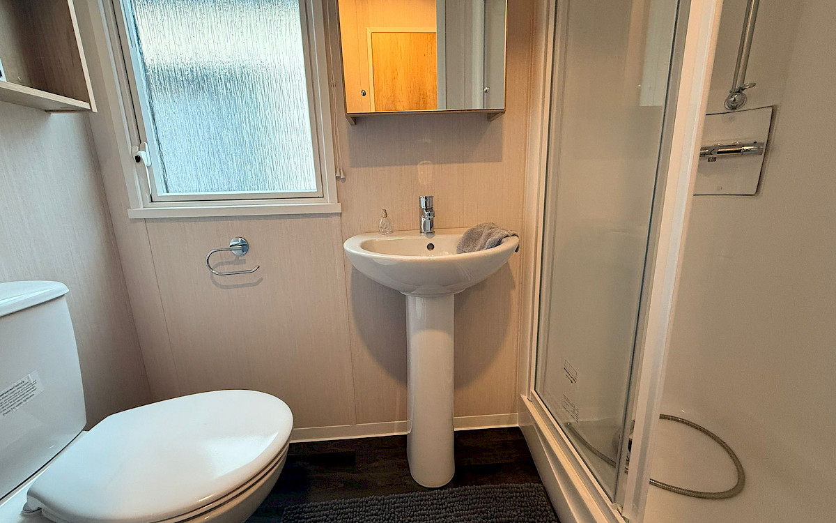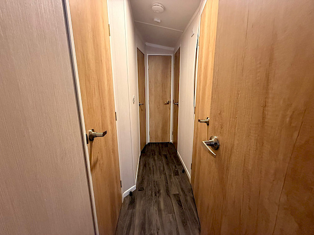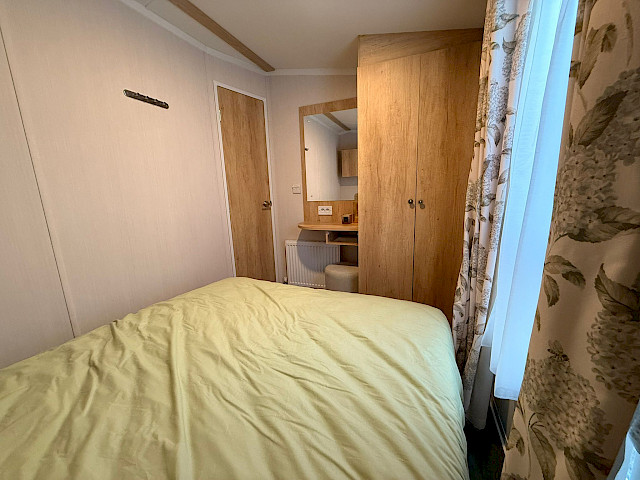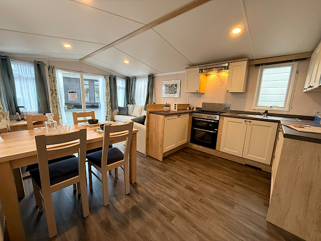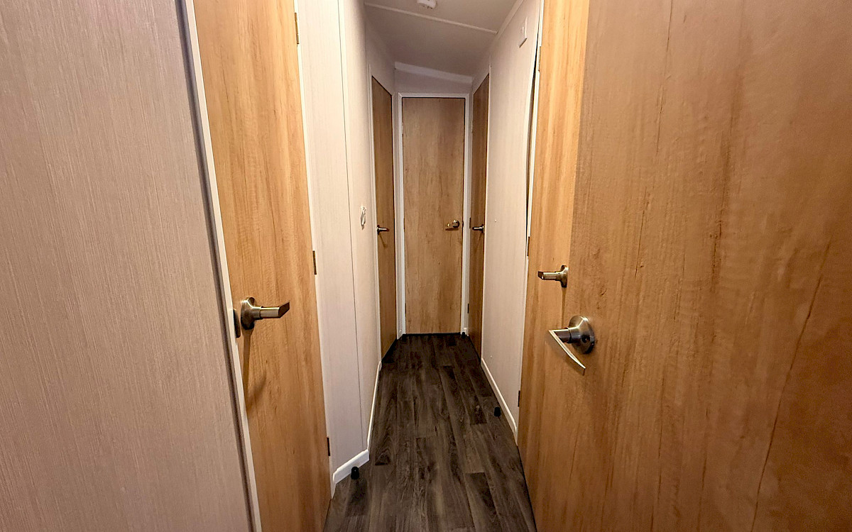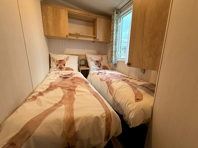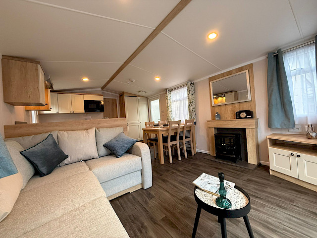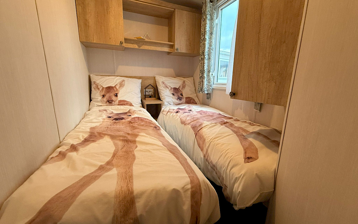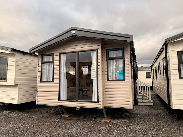 The Swift Burgundy has a timeless and practical design. The botanical upholstery and garden doors at the front of this holiday chalet bring nature from the outside in. The Burgundy is therefore not one of Swift's most popular leisure models for nothing. The cosy living room with electric fireplace and spacious U-kitchen are an ideal living environment during your holiday stay. The bedrooms are equipped with luxury mattresses and in the small bedroom, one bed can be stored under the other for extra space. Curious about this model? Feel free to visit our show site and discover this model.