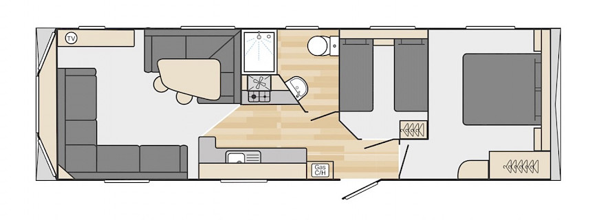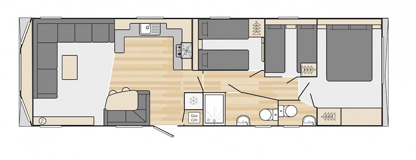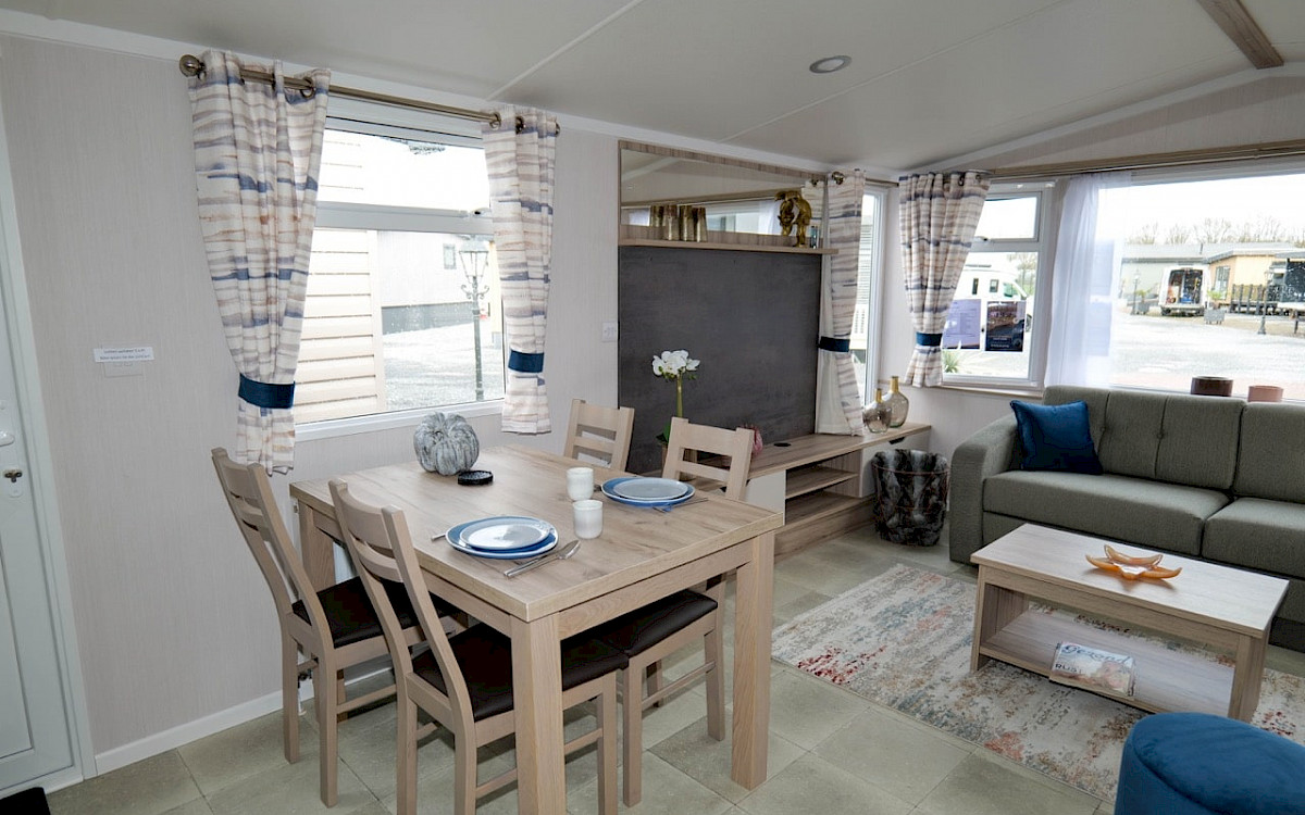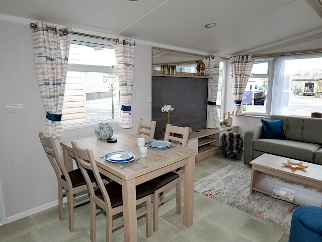 The Loire is light, fun, functional and inspired by the coast. You can choose from models of 10 and 11 metres long. The Loire is truly a family-friendly leisure chalet and has good value for money, as well as very extensive options. In the living room, for example, you will find a spacious corner bench that can also be used as a sofa bed. The spacious kitchen has sturdy stainless steel handles and luxury appliances. The bedrooms are equipped with luxury mattresses and a TV connection. Curious? You are welcome to come and view this model in our showroom.