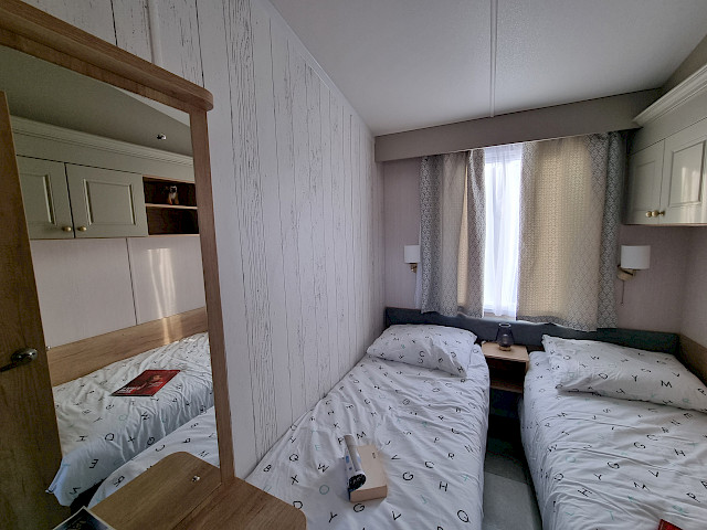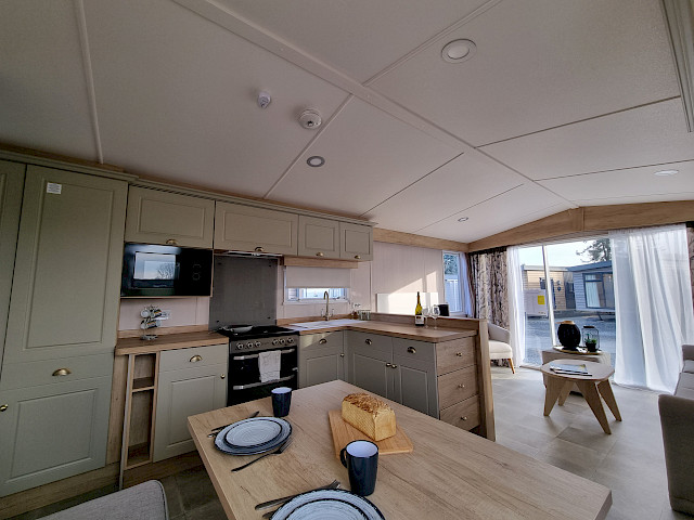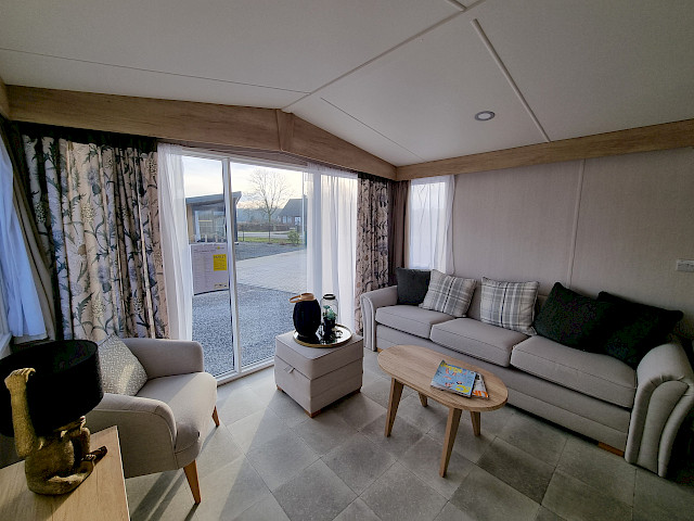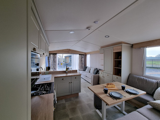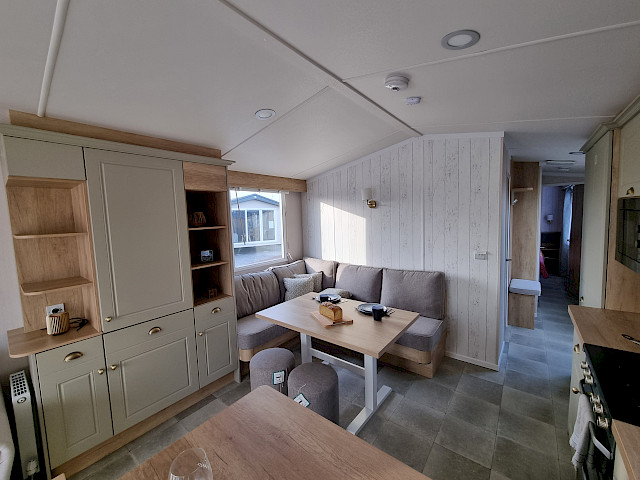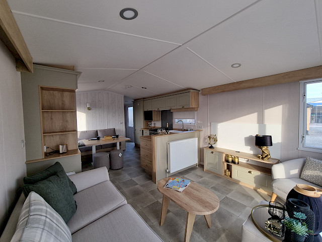 The Swift Moselle is available in two interior styles; Country and Scandi. The chosen style can be found throughout the chalet. You can arrange the living room of the Swift Moselle yourself. On both sides of the chalet there is a TV connection so you can turn the position of the couch and TV so you can not only enjoy watching TV but also enjoy the beautiful view through the large front window. Furthermore, the kitchen and dining area is very open plan for optimal coziness during your vacation. This luxury model has extra soft mattresses in the bedrooms and an ensuite bathroom/toilet in the master bedroom. Ready to enjoy the Swift Moselle? Visit our show grounds soon and enjoy the Swift Moselle this season.