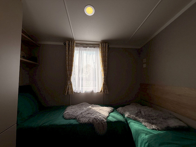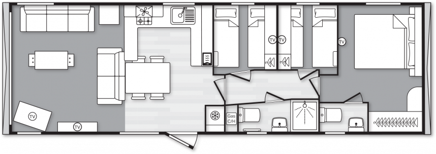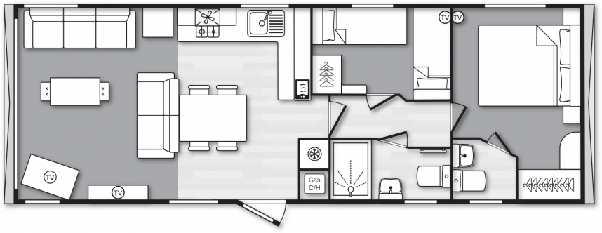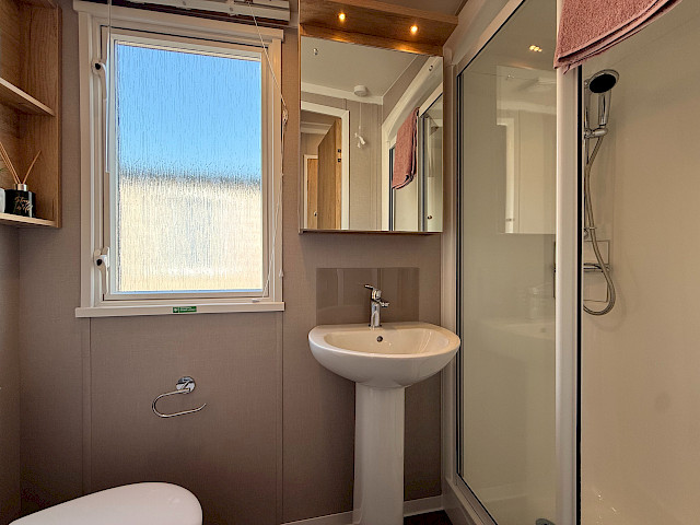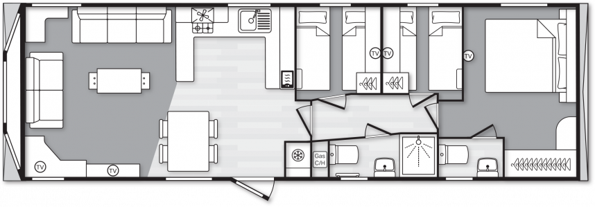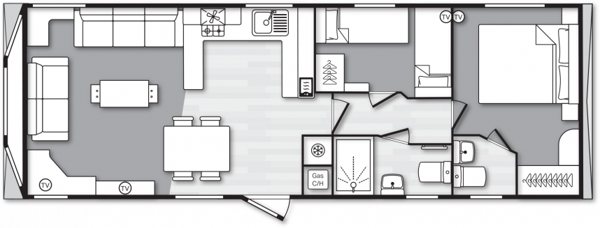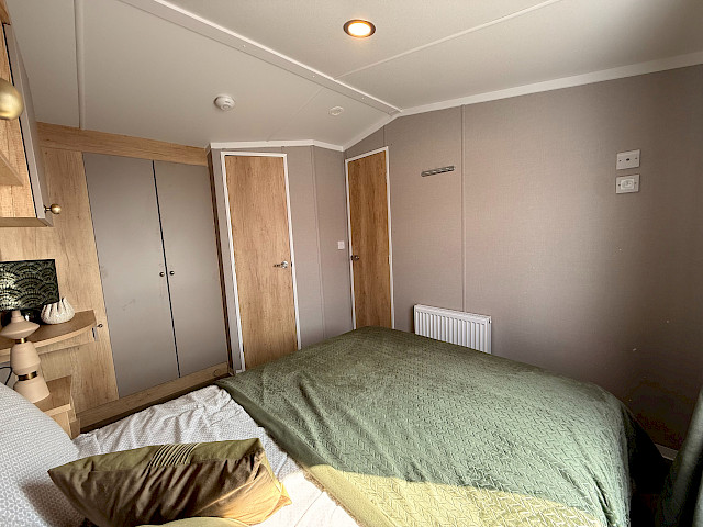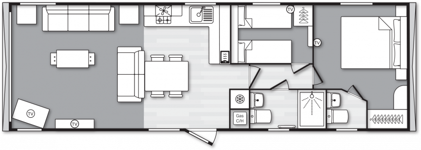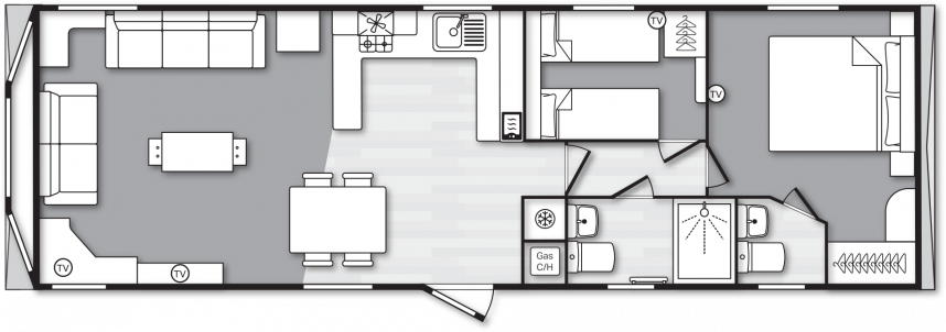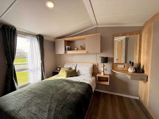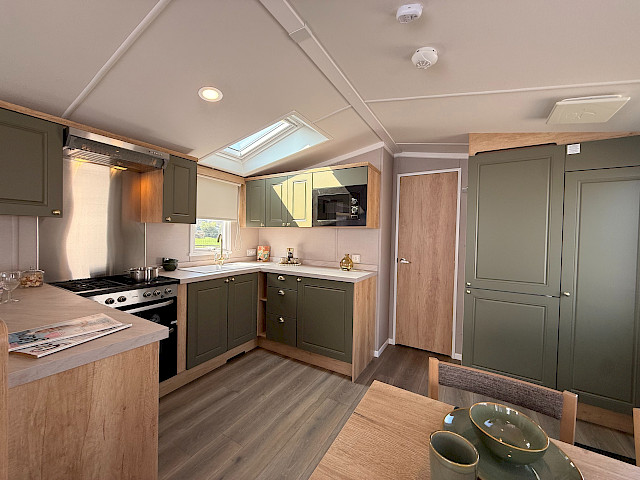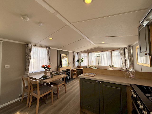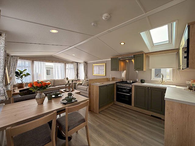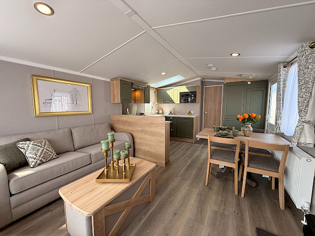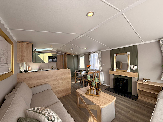 The Swift Provence feels instantly welcoming the moment you step inside. The layout is perfectly balanced: the living room, dining area and kitchen flow seamlessly into one another. The sofas, table, chairs and decorative fireplace are included and immediately create a cosy atmosphere. Handy extras are already fitted without being visible, such as the storage compartments under the coffee table and the extra bed that can be pulled out from the sofa if needed. The kitchen is laid out in an L- or U-shape, depending on the size of the mobile home, and comes complete with a hob, oven, microwave and fridge-freezer. The master bedroom even has an en-suite toilet, which makes the layout surprisingly convenient for everyday use or when you have guests.
