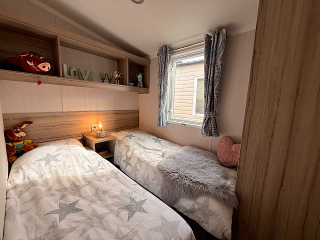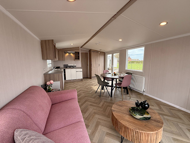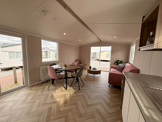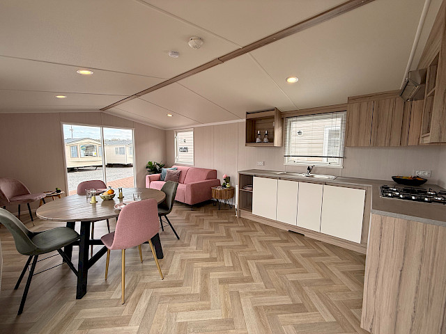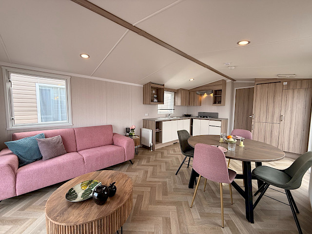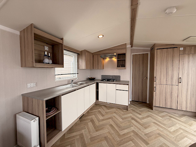The Swift Royan Special combines a fresh, modern look with plastic exterior cladding, large windows and double patio doors for maximum natural light. Inside, there is a modern PVC herringbone floor, which gives the space a luxurious and contemporary feel. The spacious L-shaped kitchen is equipped with a gas hob and a fridge-freezer. The mobile home has two bedrooms and a bathroom with a shower and toilet. LED spotlights have been fitted throughout the mobile home to provide modern, atmospheric lighting. As this Royan Special is supplied unfurnished, you can furnish it entirely to your own taste and style.