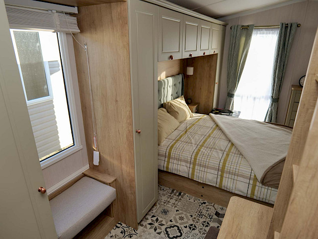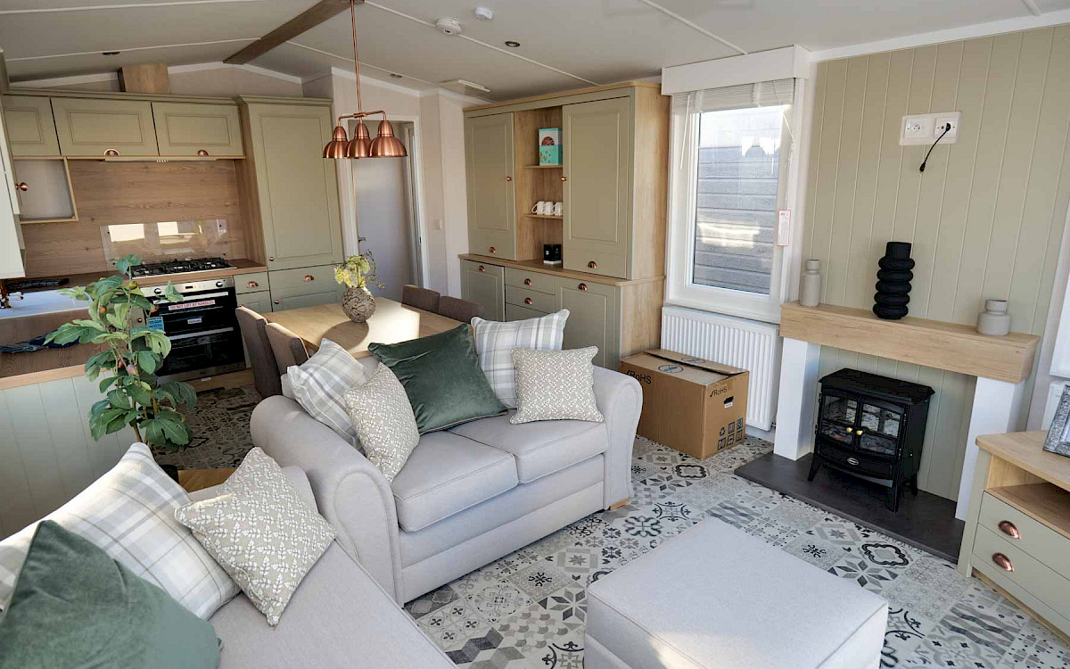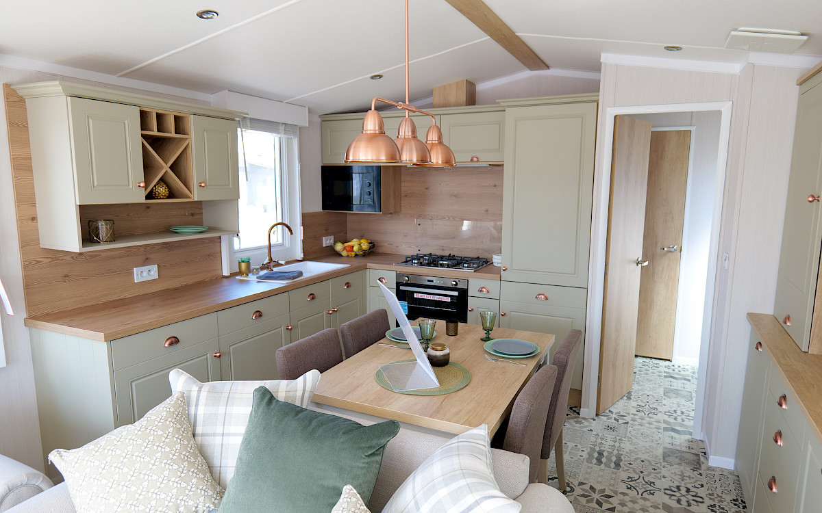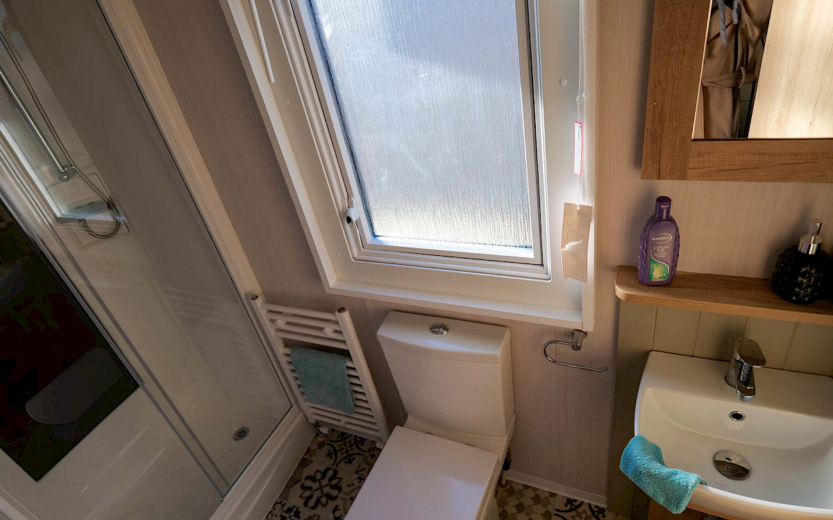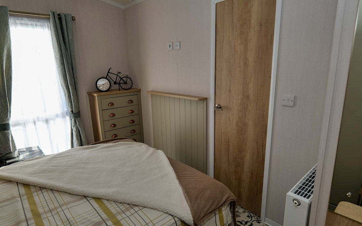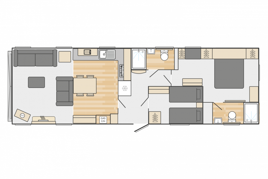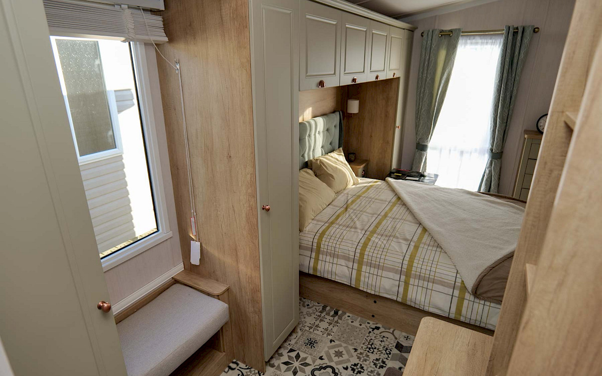 The Swift Vendee is a very luxurious holiday home inside and out. The Vendee is surprisingly spacious with its large living room, hall with coat rack and sofa, master bedroom with en-suite bathroom and second bedroom. After entering the spacious hall , you enter the luxurious living-dining area on the left. The sofas are wonderfully soft and offer the ultimate comfort. The living room also has a television and a luxurious electric fireplace. The beautiful kitchen with copper details is richly equipped with, among other things, an integrated fridge-freezer, a microwave oven and an integrated wine rack! This holiday chalet has 2 bedrooms and 2 full bathrooms. This way, you can easily accommodate four people on holiday.