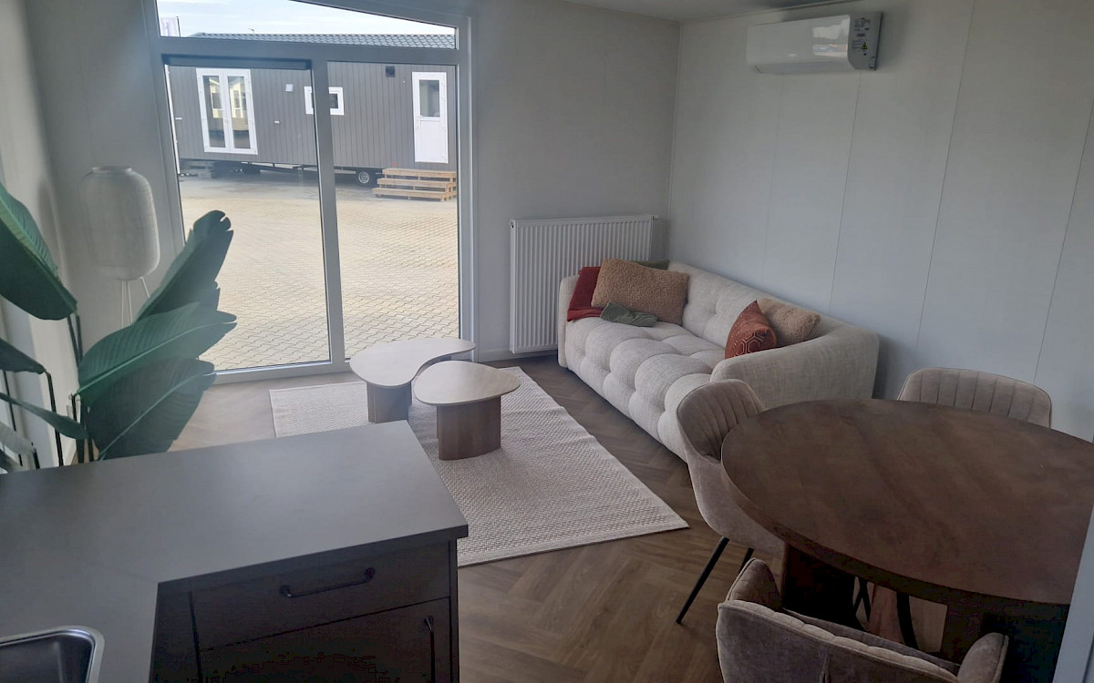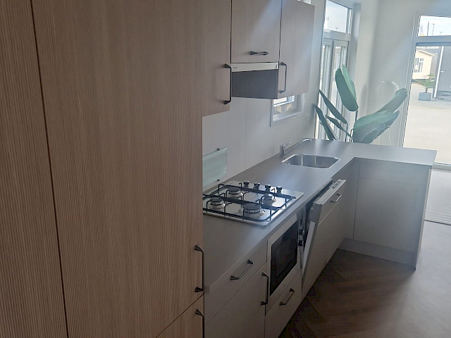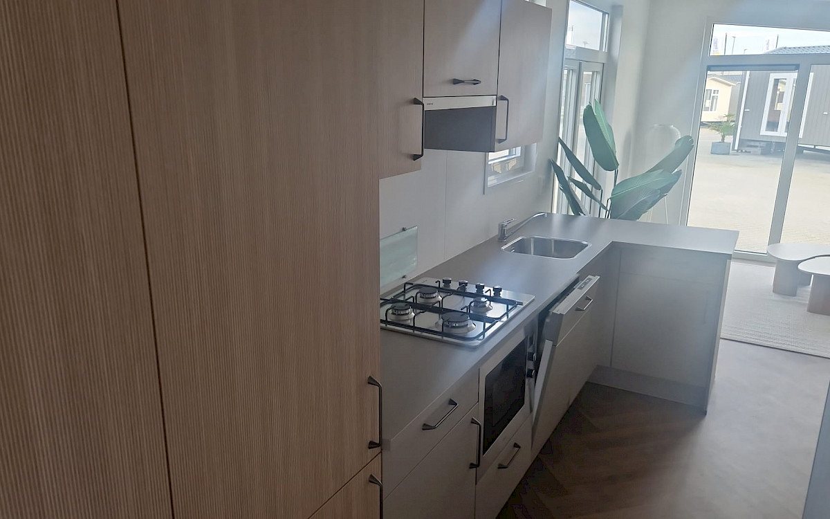 The images above show the following model: 1100 x 400 - 2 bedrooms. With the following options: contrasting façade, black rain pipe, black fascia boards, 1x spotlight in overhang, 3x extra spotlights in overhang, vertical slatted wall cladding, vinyl flooring, blackout pleated blinds, junction box, wall-mounted air conditioning, air conditioning ducting in the wall, black window frames, dishwasher, square sink, luxury sliding wardrobe with doors and a wall-mounted toilet. Total price: €94,930.