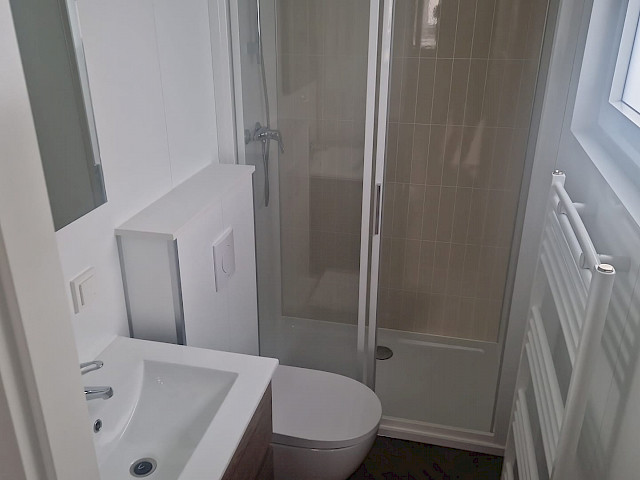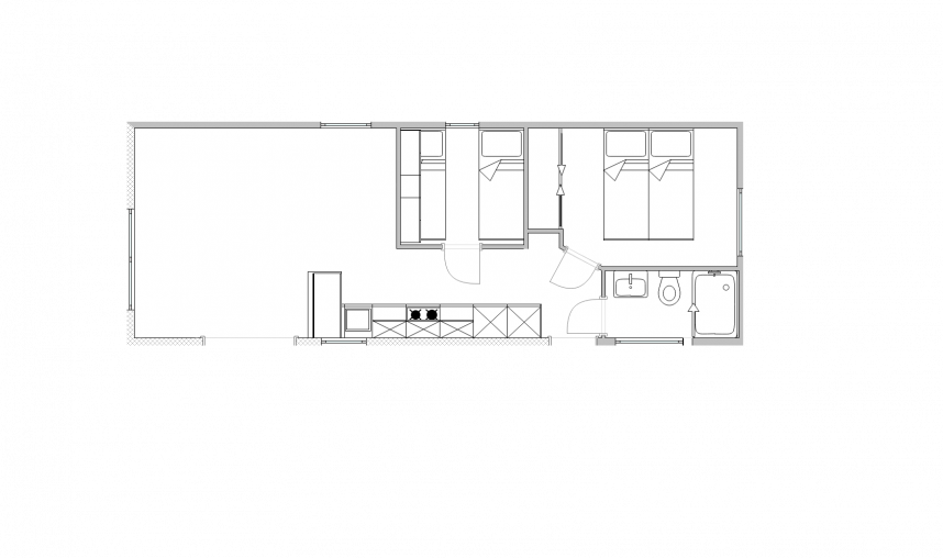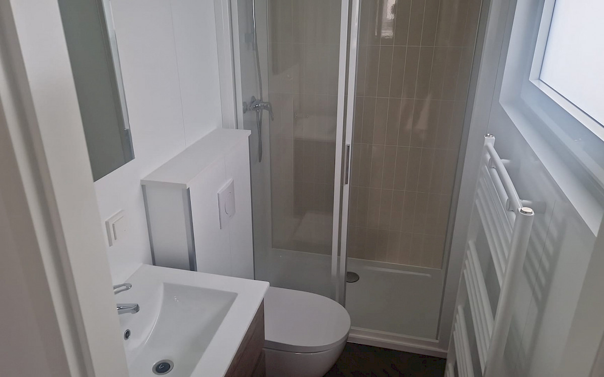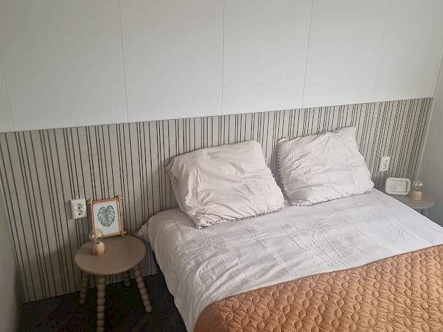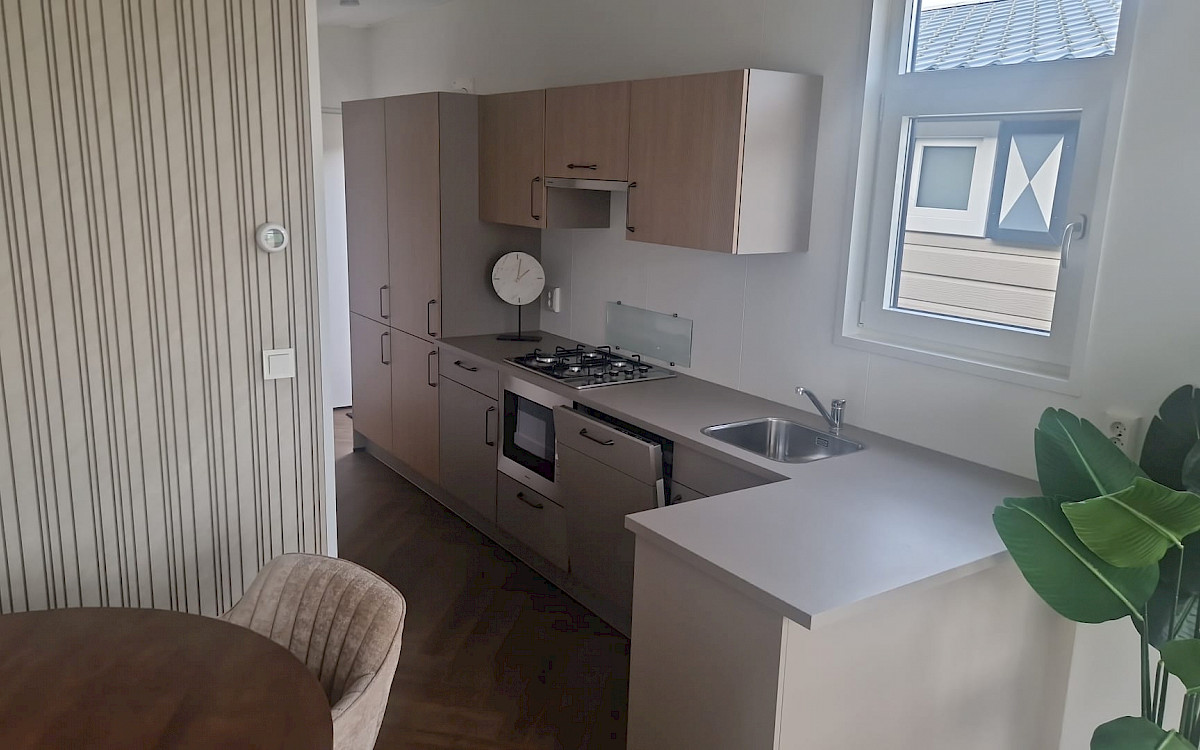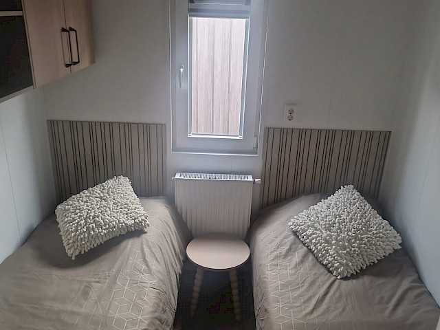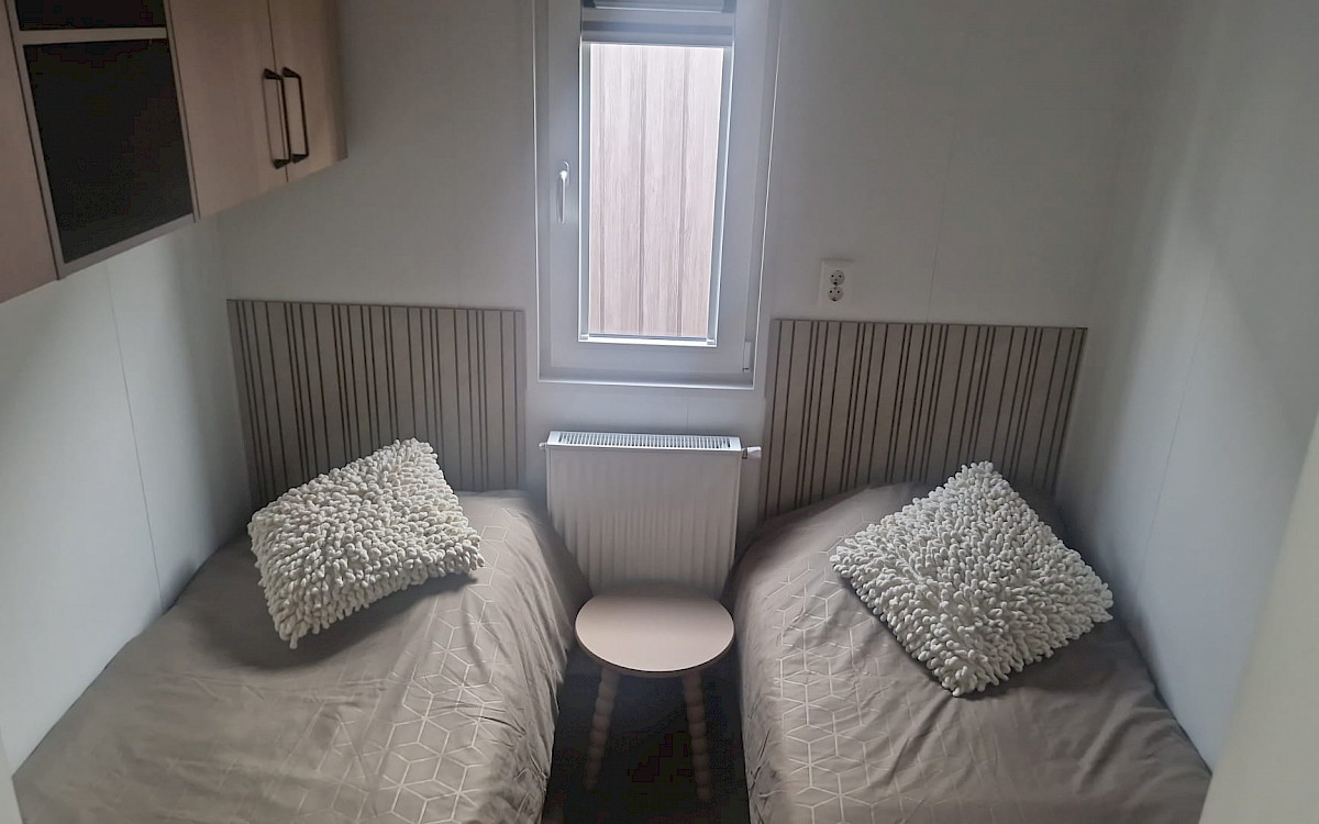 The Volente Deluxe offers everything you need for a comfortable stay. The spacious living room has vinyl flooring, large patio doors and a TV connection. The L-shaped kitchen is fully equipped, with plenty of storage space, a 4-burner hob, extractor hood and a built-in fridge/freezer. The master bedroom has a double bed and a spacious wardrobe with sliding doors. The guest/children's room has two single beds and handy hanging cupboards for extra storage space. The modern bathroom features a stylish vanity unit, a designer radiator, a toilet and a spacious shower cubicle with a tile pattern on the wall. The chalet is finished with wood-effect plastic cladding, plastic window frames, double glazing and central heating - a perfect balance between comfort and sustainability.