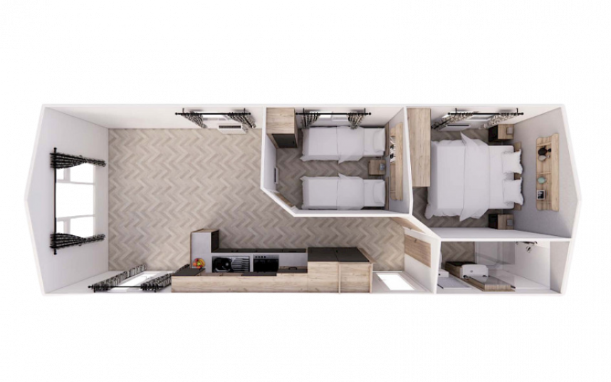 With the Willerby Lumic, you bring home great value at a competitive price. This static caravan is 10 meters long and offers enough space for the whole family with its two comfortable bedrooms. The modern color scheme of the interior, the spacious kitchen with a gas cooker, and the option to add extras like a dishwasher make the Lumic a stylish and complete choice for those who love luxury. Additionally, the Lumic is equipped with Willerby’s unique GreEN Standard label, meaning that this caravan consumes up to 28% less energy.