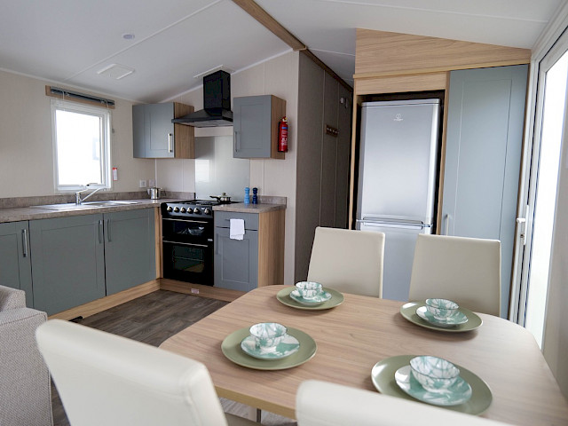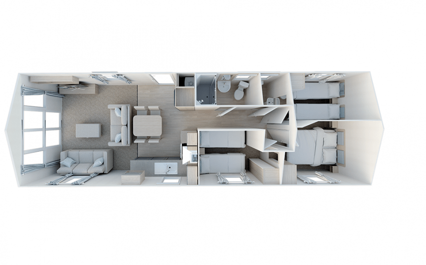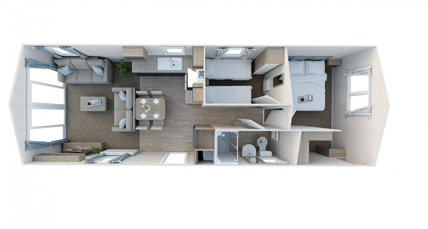 The Willerby Malton is just new to our range. A fresh model with a blue-grey exterior cladding and sturdy black downspouts. This Malton has two bedrooms and is fully equipped. It is one of the few that has a TV connection in both bedrooms and of course in the living room. So you can watch TV in every room.