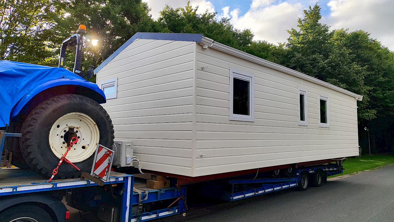 The delivery of the chalet to our location near the North Sea was equally impressive. Maneuvering through narrow access roads and seemingly impossible turns was carried out with great skill.
