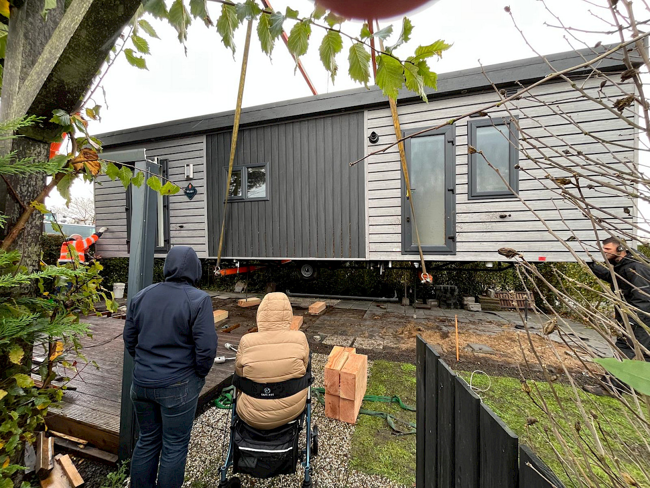 The placement day itself was one with rain, cold, and strong winds, but despite this, the chalet was positioned perfectly. The cooperation between the De Bergjes team and the skilled crane operator from Mol Zierikzee truly made the difference.